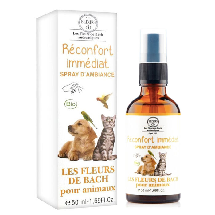 Fleurs de Bach pour animaux Réconfort immédiat ELIXIRS & CO discount, le spray d’ambiance aux extraits de fleurs de bach et huiles essentielles dans votre parapharmacie en ligne à prix discount, qui détend et apaise immédiatement les animaux pouvant être stressés par des changements (déménagement, séparation, arrivée d’un animal ou d’un enfant,…). Les fleurs de Bach sont élaborées en respectant rigoureusement la méthode originale et l’esprit authentique du Docteur Bach. La gamme pour Animaux des Fleurs de Bach développé avec les conseils du vétérinaire Docteur Pierre Rousselet-Blanc, est destinée aux bien-être des animaux. A base de végétaux naturels ces produits vont améliorer le bien-être de l’animal (chiens, chats, lapins, chevaux, oiseaux,…) lors de stress, agressivité, peur, déprime,… 100% naturel, le spray Pour animaux Réconfort immédiat, adapté pour les animaux de compagnie stressés (chiens, chats, chevaux, oiseaux,…) est composé de 7 fleurs de Bach Originales (Clématite, Dame d’onze heure, Hélianthème, Impatiente, Pommier sauvage, Prunus Gnavelle) qui permettent d’apaiser les nerfs et la souffrance, de retrouver ses esprits, de surmonter la panique, de contrebalancer le ou les chocs, d’aider à la résolution, de ramener le calme et la tranquillité, et reprendre le contrôle de soi. Sa formule est complétée par 4 huiles essentielles de Sauge sclarée, Menthe verte, Lavandin, et Verveine exotique faiblement dosées (0,5%).