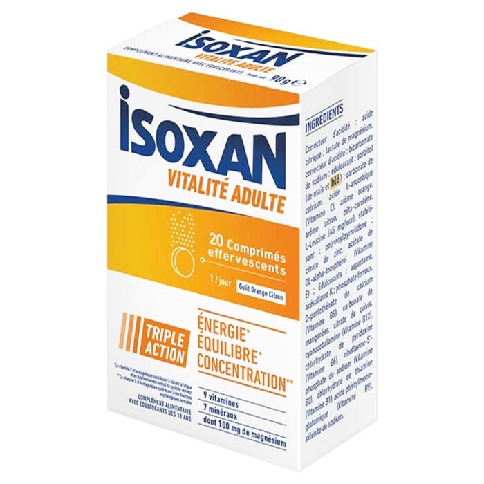 ISOXAN VITALITE ADULTE 20 COMPRIMES EFFERVESCENTS ORANGE CITRON, en vente en ligne sur le site de votre parapharmacie à prix discount .Découvrez ISOXAN VITALITE ADULTE, un complément alimentaire essentiel pour maintenir votre vitalité au quotidien. Développé par le laboratoire ISOXAN, ce produit de qualité vous offre une formule unique pour booster votre énergie lors de fatigue passagère. Les comprimés effervescents ISOXAN VITALITE ADULTE sont spécialement conçus pour les adultes actifs qui souhaitent retrouver une vitalité optimale. Grâce à sa délicieuse saveur d’orange citron, ISOXAN VITALITE ADULTE sera un véritable plaisir. Ce complément alimentaire contient une combinaison d’ingrédients essentiels pour vous aider à maintenir votre énergie tout au long de la journée. Il est enrichi en vitamines B, C ainsi qu’en minéraux tels que le magnésium et le fer. Les vitamines B et C s’associent au magnésium pour réduire la fatigue et participer aux fonctions psychologique normales (apprentissage, concentration, mémoire). ISOXAN VITALITE ADULTE est idéal pour les personnes qui mènent une vie active et qui ont besoin d’un coup de pouce pour rester en forme. Que vous soyez sportif, étudiant ou professionnel, ce complément alimentaire vous accompagnera dans toutes vos activités