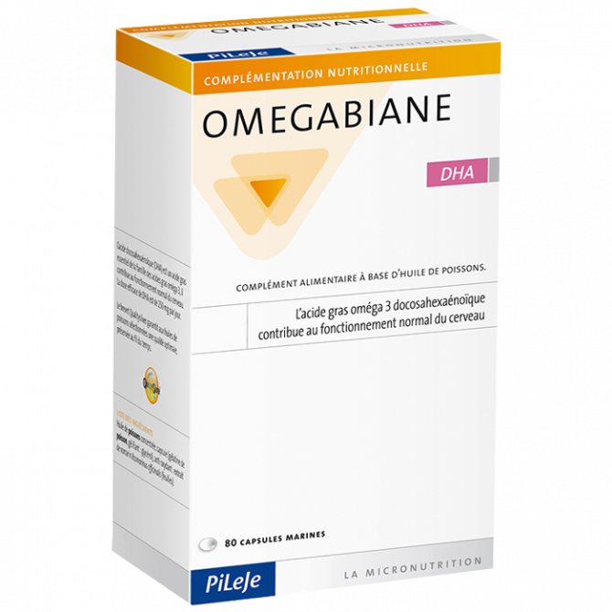 OMEGABIANE DHA des laboratoires PILEJE à prix discount dans votre parapharmacie en ligne, un complément nutritionnel à base d’acide gras Oméga 3 DHA qui contribue au fonctionnement normal cérébral. 80 capsules Depuis 20 ans, les laboratoires PILEJE développent des gammes complètes de compléments alimentaires de haute technicité, apportant des réponses de qualité aux consommateurs soucieux de leur santé et leur bien-être. La gamme de Complémentation Nutritionnelle propose des produits formulés à base de vitamines, minéraux et oligo-éléments, acides aminés ou acides gras essentiels hautement assimilables. OMEGABIANE DHA apporte 347 mg de DHA par capsule. Le DHA est l’un des acides gras de la famille des omégas 3 et il participe au fonctionnement normal de notre cerveau.